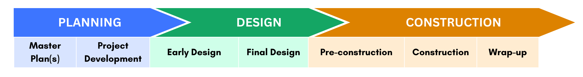 Projects unfold through several phases of development and construction. The public is engaged throughout the process through community meetings and public comment periods. The length of a project can vary depending on factors such as funding. Here​​​ is a general timeline that projects follow: